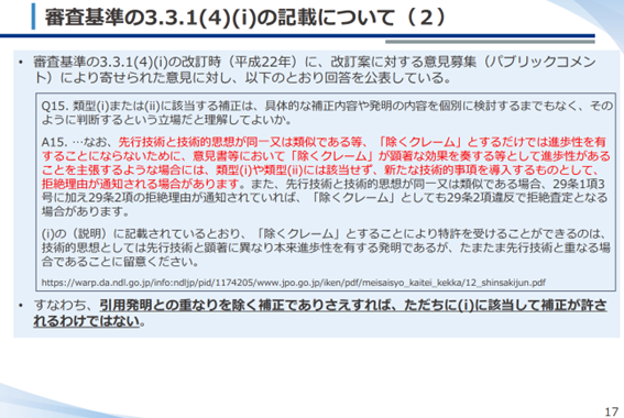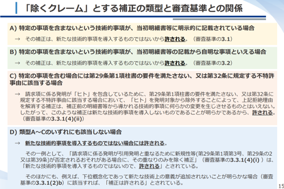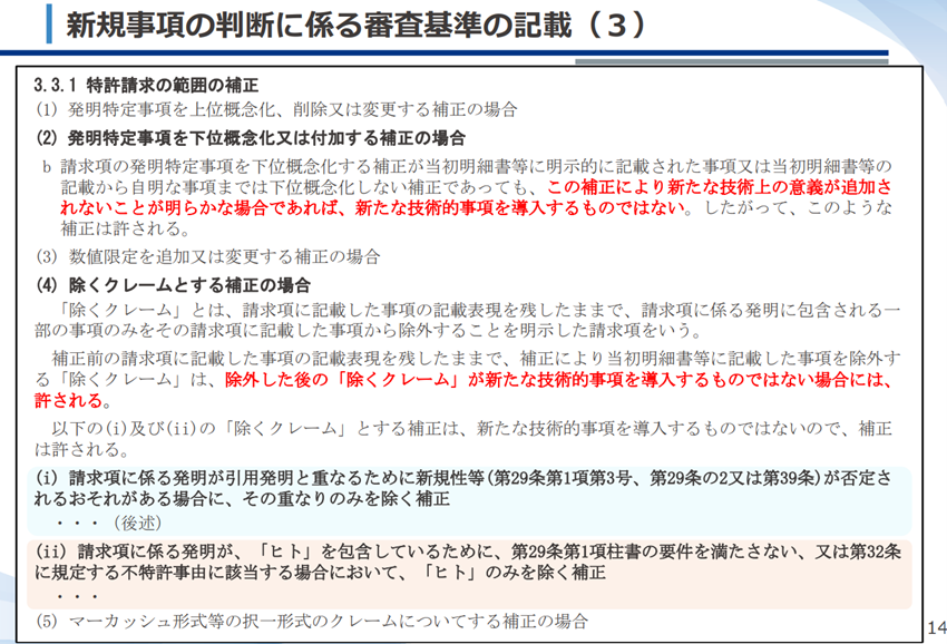 特に、2025年に、特許庁からいわゆる『除くクレーム』の補正要件を厳格化する方向で、審査基準改訂を示唆するメッセージが出されている。特許として成立した『除くクレーム』の発明のなかに新規事項追加の無効理由を有すると判断されるものが現れれば、上記問題が顕在化し、今後、特許実務が混乱する事態が懸念される。(産業構造審議会 知的財産分科会 特許制度小委員会第18回 審査基準専門委員会ワーキンググループ資料参照)