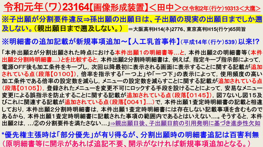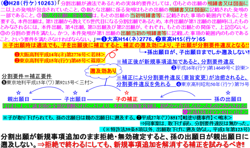 子出願の分割出願についてみると,子出願の…補正は,親出願の出願当初明細書又は図面に記載されておらず,子出願の出願当初明細書又は図面にも記載されていない事項を含み,上記補正後の子出願の明細書は,親出願の出願当初明細書又は図面の範囲内でない事項を含むものであるから,子出願は,親出願から特許法44条1項に基づき適法に分割されたものといえないことになる。そして,子出願は,その後,特許登録され,本件無効審決を経て確定し,もはや,手続補正や訂正審判により…手続補正書による内容を是正する余地はなく,上記補正後の内容で確定したから,子出願は,親出願から特許法44条1項に基づき適法に分割されたものとはいえず,親出願の時に出願したとみなされることはない。そして,親出願の時に出願したとみなされないことから,…子出願の出願日は…補正書を提出した日…とみなされることになる。…この点に関し,原告は,子出願が特許法44条により適法に分割された分割出願であり,…手続補正書による補正により,特許法40条に基づき,出願日が…繰り下がったに過ぎず,子出願の分割自体が不適法,無効となるものでない旨主張するが,…そもそも子出願の分割は分割要件を具備しておらず不適法であることは明らかであって,原告の上記主張は採用することはできない。…